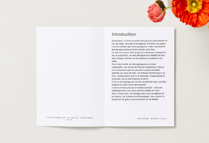 « En écoutant ses récits, j’ai ressenti le besoin profond de ne pas laisser ces souvenirs, ces miracles et ces leçons de vie se perdre. Je voulais créer plus qu’un simple recueil de souvenirs ; je voulais créer un objet qui honore son parcours, un écrin pour son témoignage. J’ai donc mis tout mon cœur à concevoir et à mettre en page son histoire, en choisissant chaque police, chaque couleur, chaque espacement pour que la forme soit à la hauteur du fond.